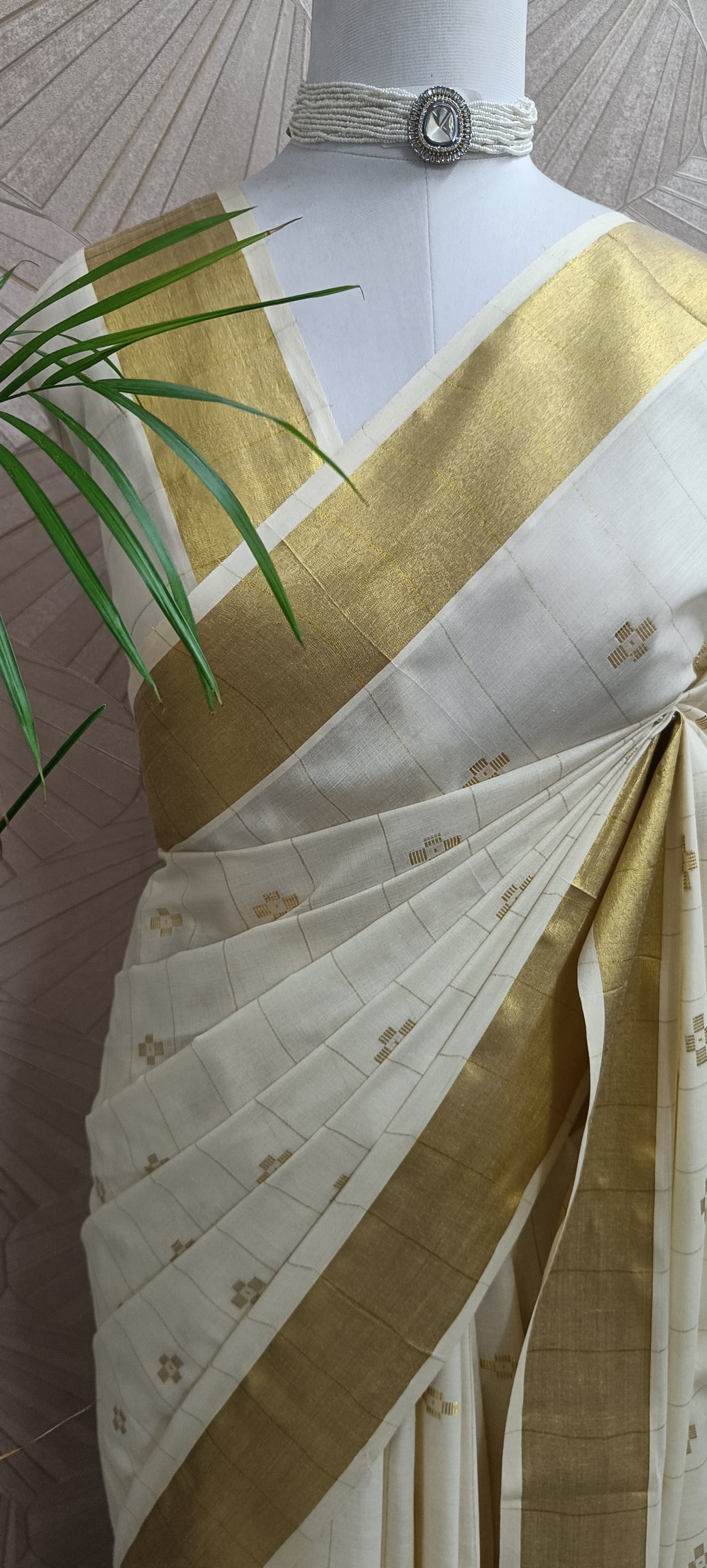 The body adorned with delicate golden woven motifs arranged in neat intervals, adding a touch of subtle sophistication to the understand ivory base.