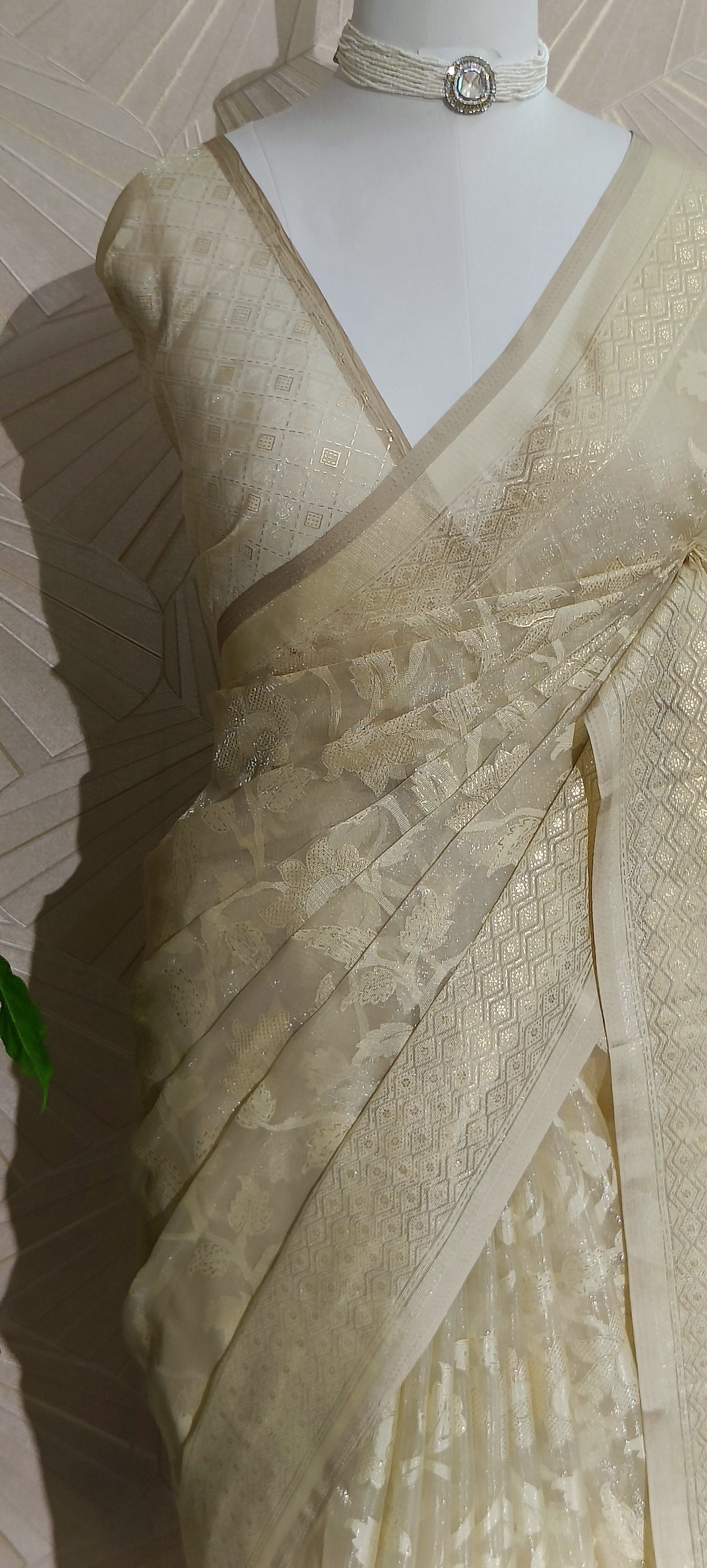 Border & Pallu : Graceful woven border with intricate geometric patterns. Minimalistic woven pallu with fine detailing for an elegant finish