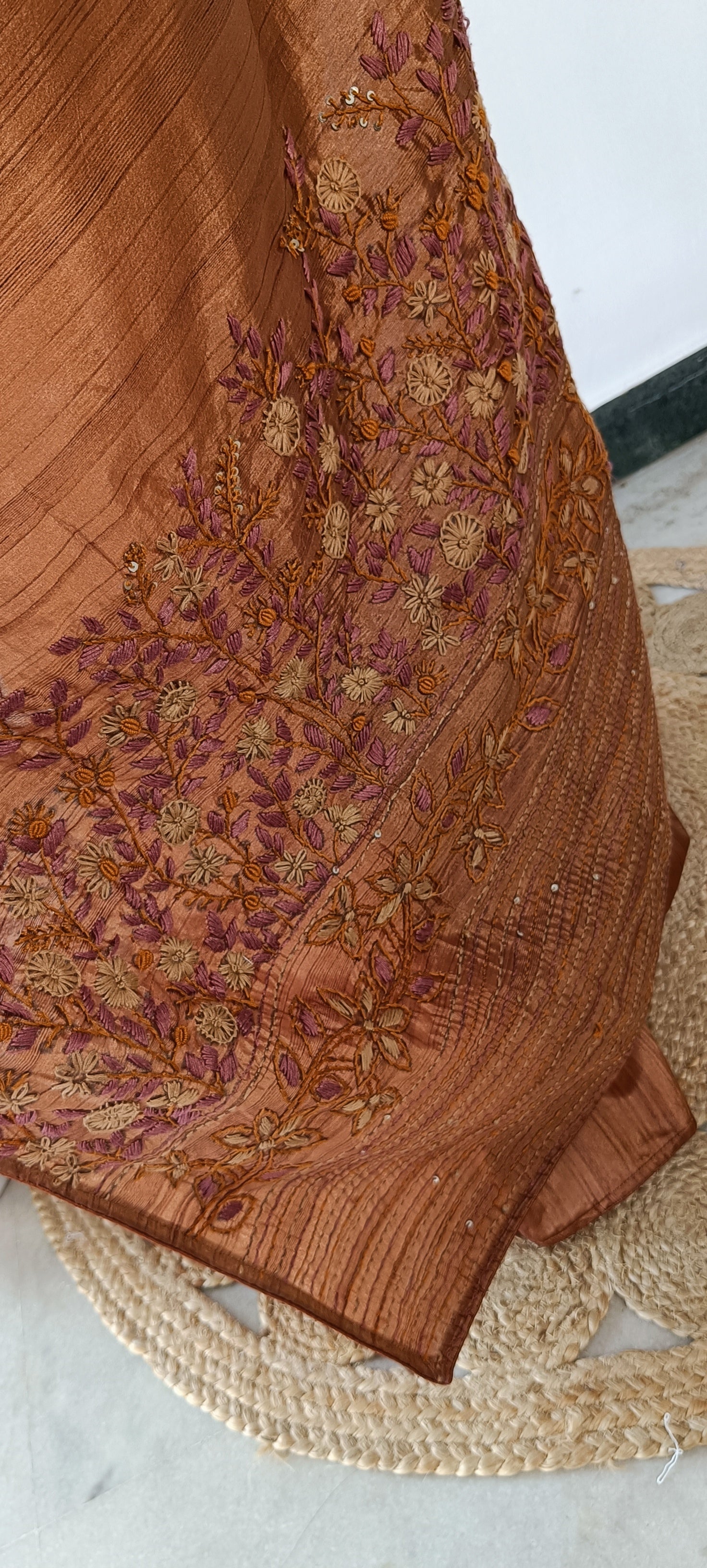 Color : Warm burnt copper / rust-brown base with subtle golden undertones Accents in muted purple, maroon, and gold threads in the embroidery
