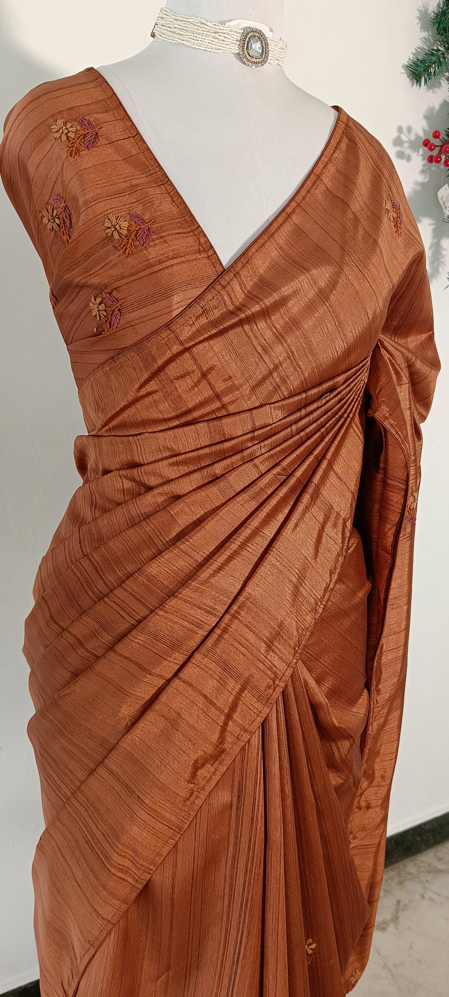 Semi Tussar Silk Saree with Hand-Embroidered Floral Motifs – Burnt Copper / Rust Brown